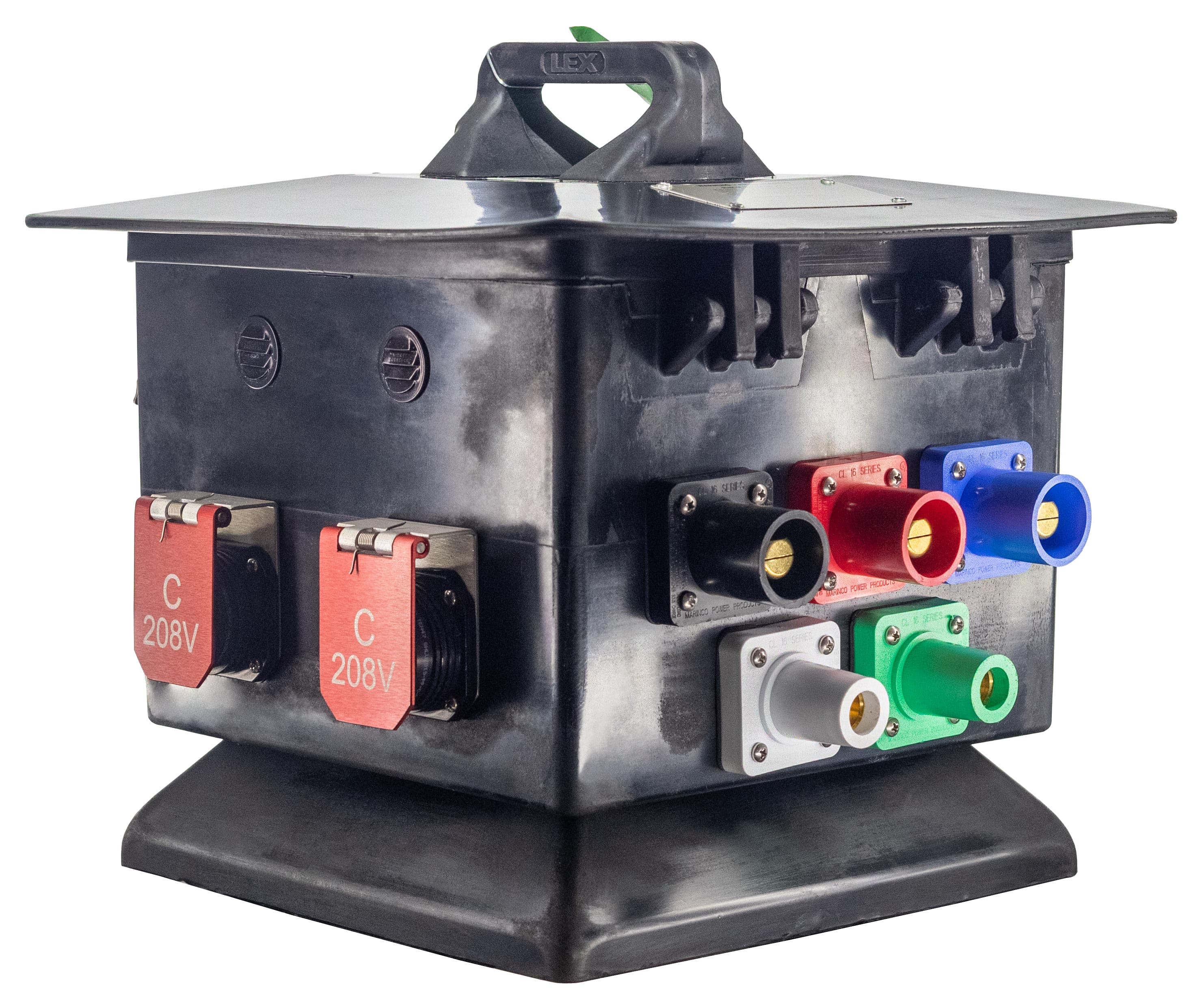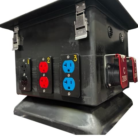 This 100 A 3-Phase Portable Power Distro delivers rugged, tour-ready power distribution for any production. A single 100 A, 3-phase camlock inlet feeds twelve 120 V GFCI-protected duplex circuits and six 208 V twist-lock receptacles, each on individual thermal magnetic breakers. Housed in a compact, powder-coated steel “pagoda” enclosure, it’s easy to rig on truss, pack in road racks, or deploy on location.